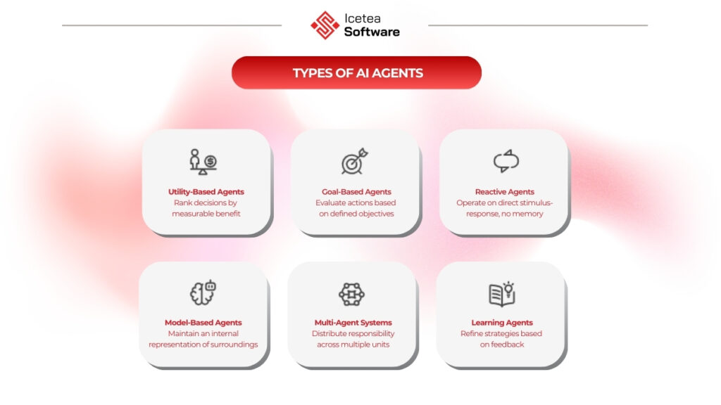 Not all AI agents operate at the same level of intelligence or autonomy. The architectural choice should reflect operational complexity, acceptable risk exposure, and the degree of decision independence required. Below are the primary categories most businesses encounter when exploring AI development.